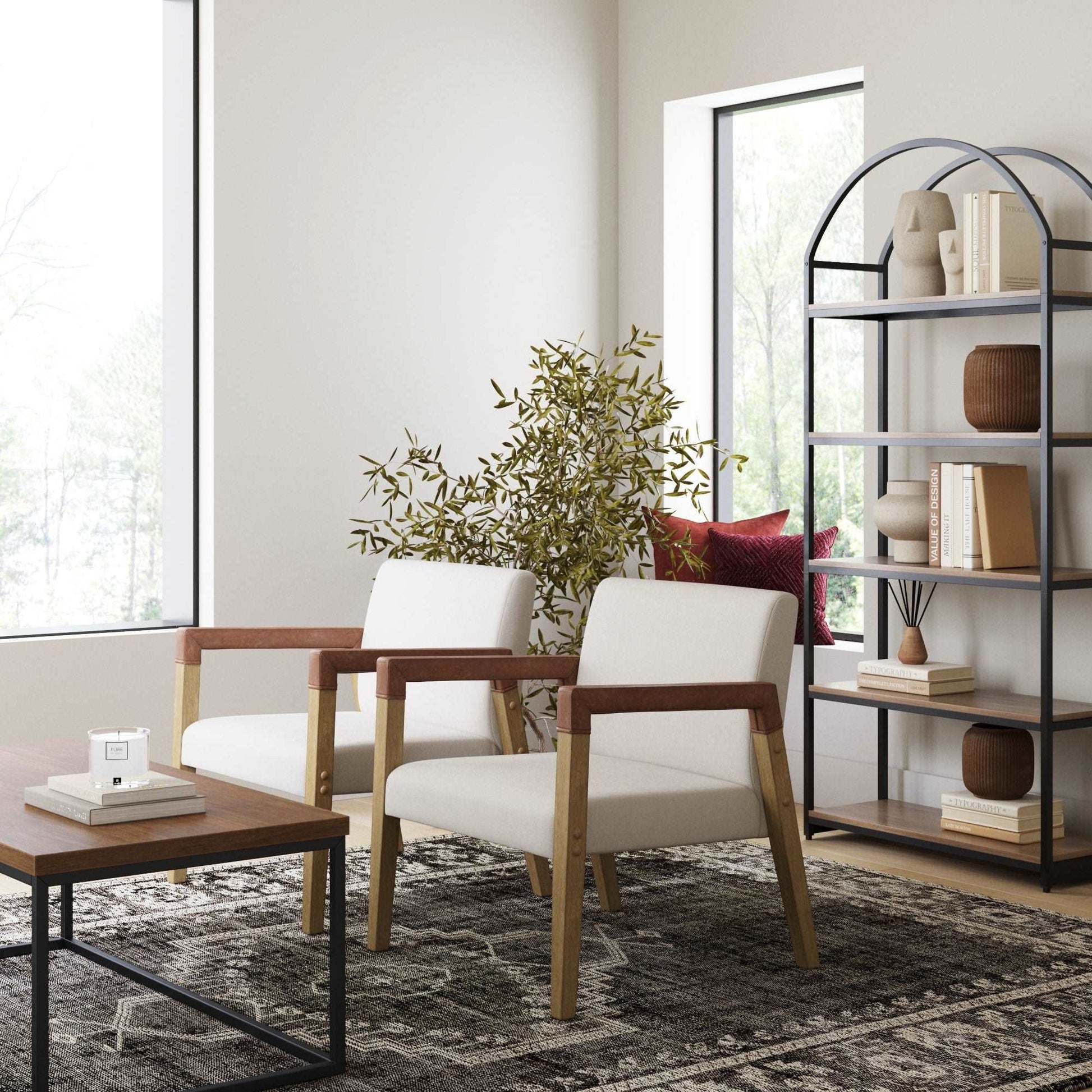 Sit back and relax in style with our Hudson living room chair. Hudson features a natural flax color fabric seat that’s plushly cushioned for extra comfort and features wire brushed wood arms wrapped in a chestnut faux leather. It’s the perfect spot to cozy up with a good book, scroll through TikTok, or even use as an extra comfy dining chair. Plus, assembly is a breeze, you'll be cozying up in no time.