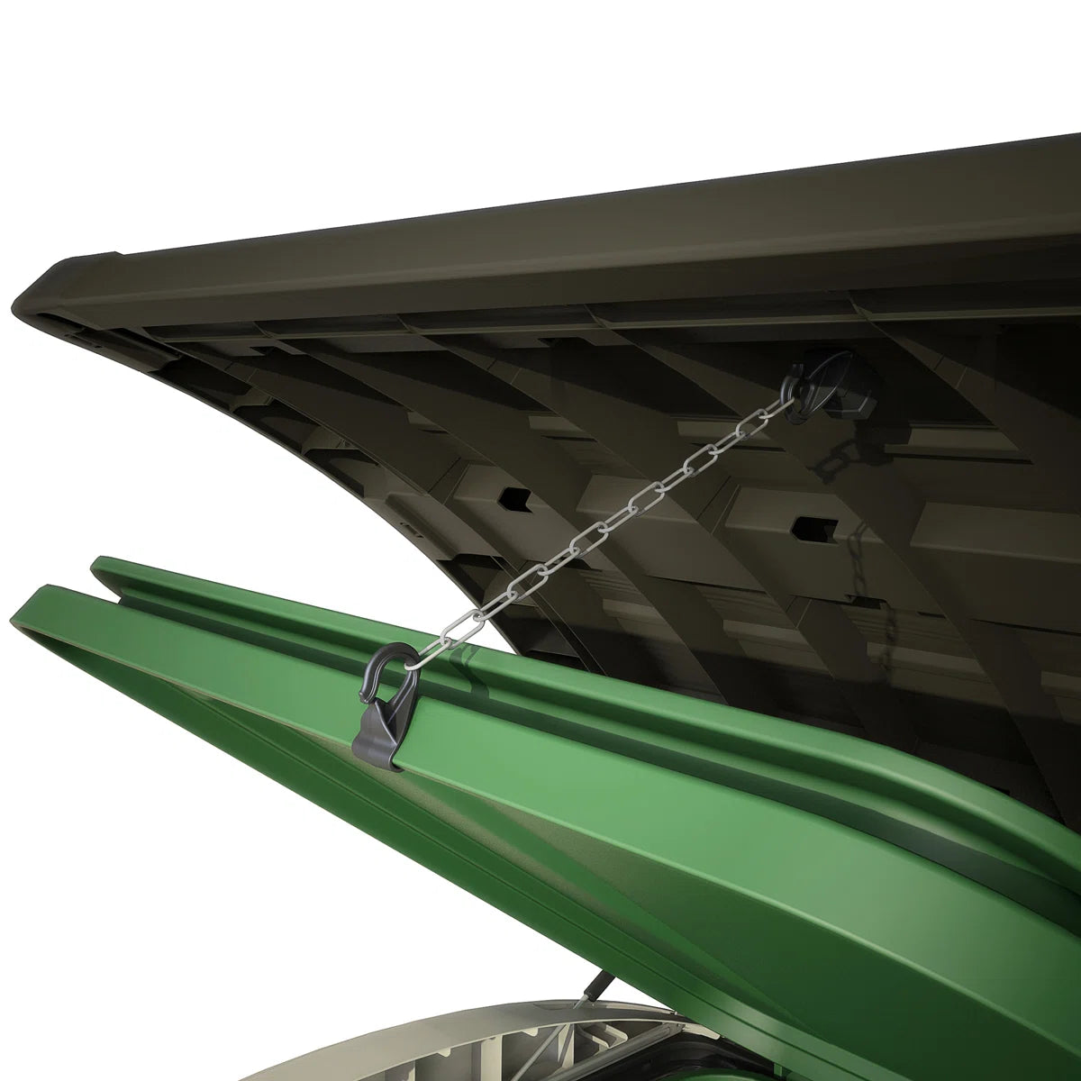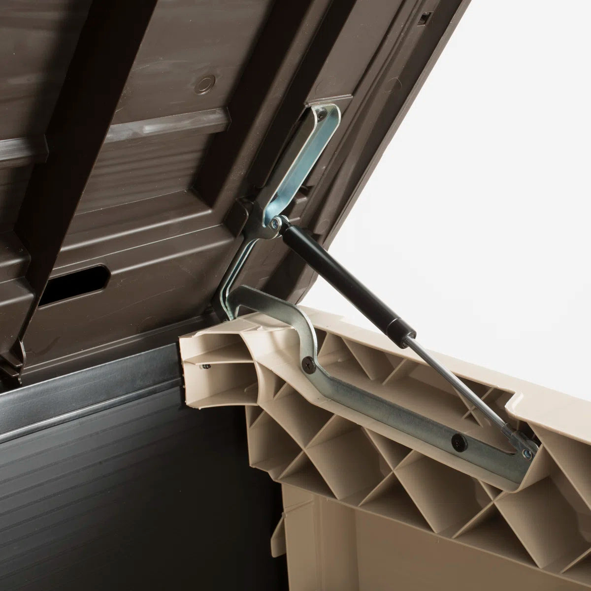 The shed offers top and front access, featuring a convenient **piston-assisted lid** and wide double doors, making loading and unloading simple. A **sloped threshold** allows items to roll in smoothly, while the heavy-duty floor and lockable design provide added security and stability.
