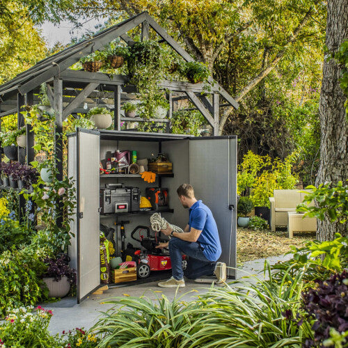 The **Keter Garden Storage Cabinet** is the perfect addition to any outdoor space, offering a practical and stylish way to organize your garden essentials. Designed with a generous internal capacity and a tall, wide structure, this cabinet provides a convenient place to store tools, cushions, cleaning supplies, or barbecue equipment, keeping everything protected, tidy, and within easy reach.
