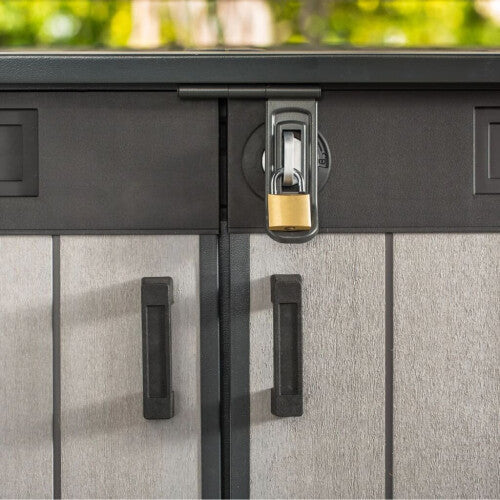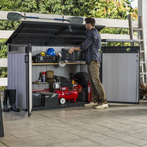 The Grande Store garden storage shed from Keter is a state-of-the-art storage solution that combines rustic style and durability. Unique material: Thanks to the unique Duotech material, the garden storage shed has the look and feel of real wood. The advantages of plastic are retained, so the garden shed is maintenance-free and weatherproof.Considerate design: The wide opening doors, the lid with gas springs and the sloping threshold give easy access to the storeroom.Adjustable design: The product can be adjusted as required so that planks can easily be fitted and the walls can be painted over. Ample storage space: The storage box is ideal for storing, for example, two 360-litre containers or three 240-litre containers. The doors are lockable for extra security.