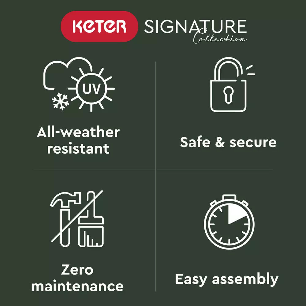 Elevate your outdoor storage with Keter's **Signature Horizontal Shed**. This premium unit features weather-resistant walls made from the new **DecoCoat innovative Composite**, offering the authentic look and feel of natural wood without the required maintenance.