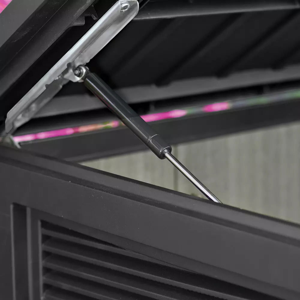 Access is effortless: the shed features front double doors and **hydraulic pistons** on the top lid for smooth, easy opening. Lockable double doors secure your items, while built-in ventilation prevents odors. A durable and stylish addition to any patio, garden, or driveway, making outdoor organization effortless. This top-tier unit is backed by the **Manufacturer's Limited Lifetime Guarantee**.
