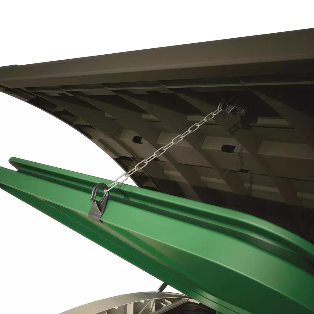 This durable, weather-resistant plastic shed provides dry and ventilated storage. Access is effortless thanks to the piston-assisted lid and two wide-opening front doors. For hands-free convenience, two lid-lifter chains are included, allowing the shed lid to open simultaneously with your wheelie bin lids.