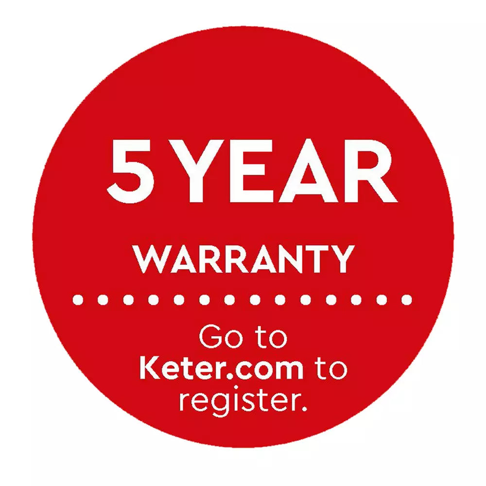 The unit features heavy-duty flooring, a sloped threshold for easy wheel-assisted entry, and multi-functional opening options (top and front). It is lockable for added security (lock not included). The Keter Store It Out Ultra is low maintenance, easy to assemble (2-person), and comes with a **manufacturer's 5-year guarantee**.